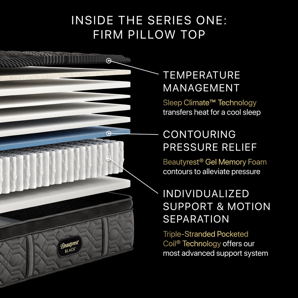 Discover where luxury meets innovation with Beautyrest Black®. Designed with Triple-Stranded Pocketed Coil® Technology, this mattress offers advanced individualized support... Discover where luxury meets innovation with Beautyrest Black®. Designed with Triple-Stranded Pocketed Coil® Technology, this mattress offers advanced individualized support and motion separation, Sleep Climate™ Technology for all-night heat transfer, and Beautyrest® Gel Memory Foam for contouring pressure relief. Experience our most advanced sleep system with Beautyrest Black®, so you can rest luxuriously. View more