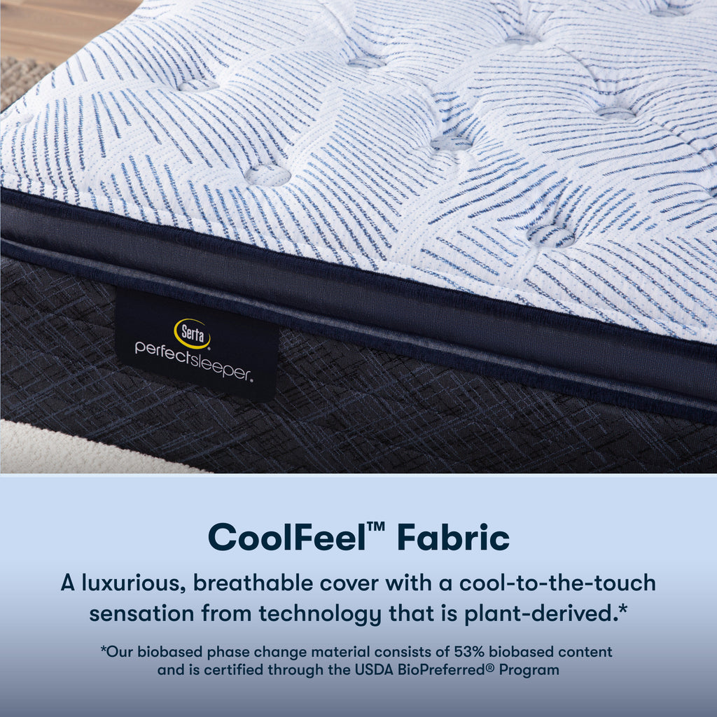 The Blue Lagoon Nights Plush Pillow Top mattress by Serta Perfect Sleeper features a CoolFeel™ Fabric with Antimicrobial Mattress Protection,... The Blue Lagoon Nights Plush Pillow Top mattress by Serta Perfect Sleeper features a CoolFeel™ Fabric with Antimicrobial Mattress Protection, Fiber layer, QuiltLoft™ Foam, PillowSoft™ Aire, a layer of Cushion Quilt™ Foam, CoolTwist® Gel Memory Foam, of CoolTwist® Gel Foam, Gel Band Support, and the Custom Support Coil System with Serta® Balanced Support Foam. This mattress will bring all the support and comfort that you need to get a good night's sleep. View more