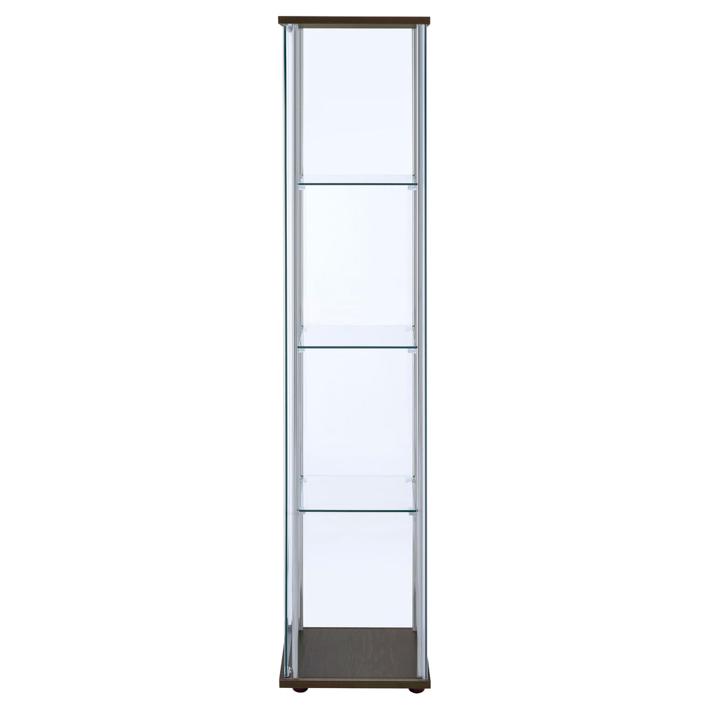 • Modern curio cabinet with rectangular top and base provides classic elegance