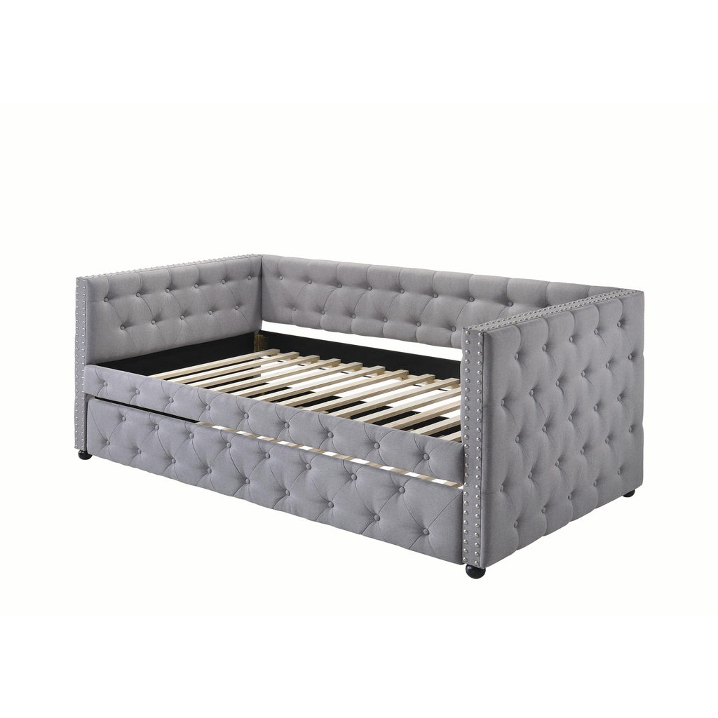 • Twin upholstered daybed with trundle in grey fabric