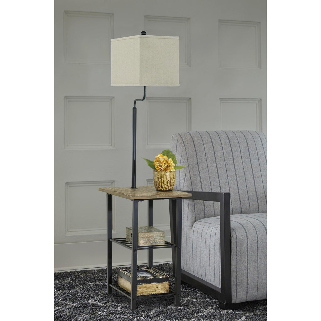 • Made of metal and wood with fabric shade